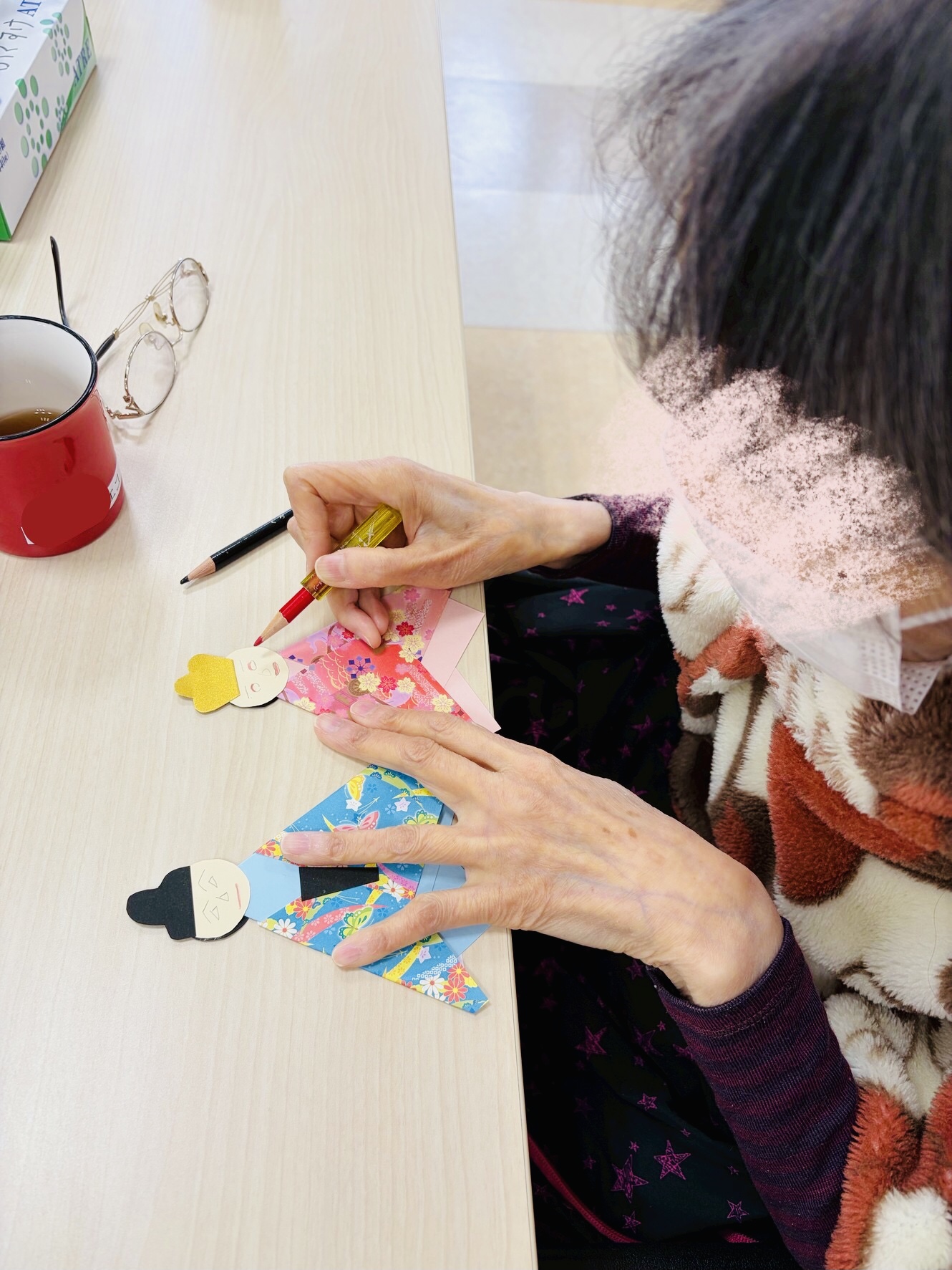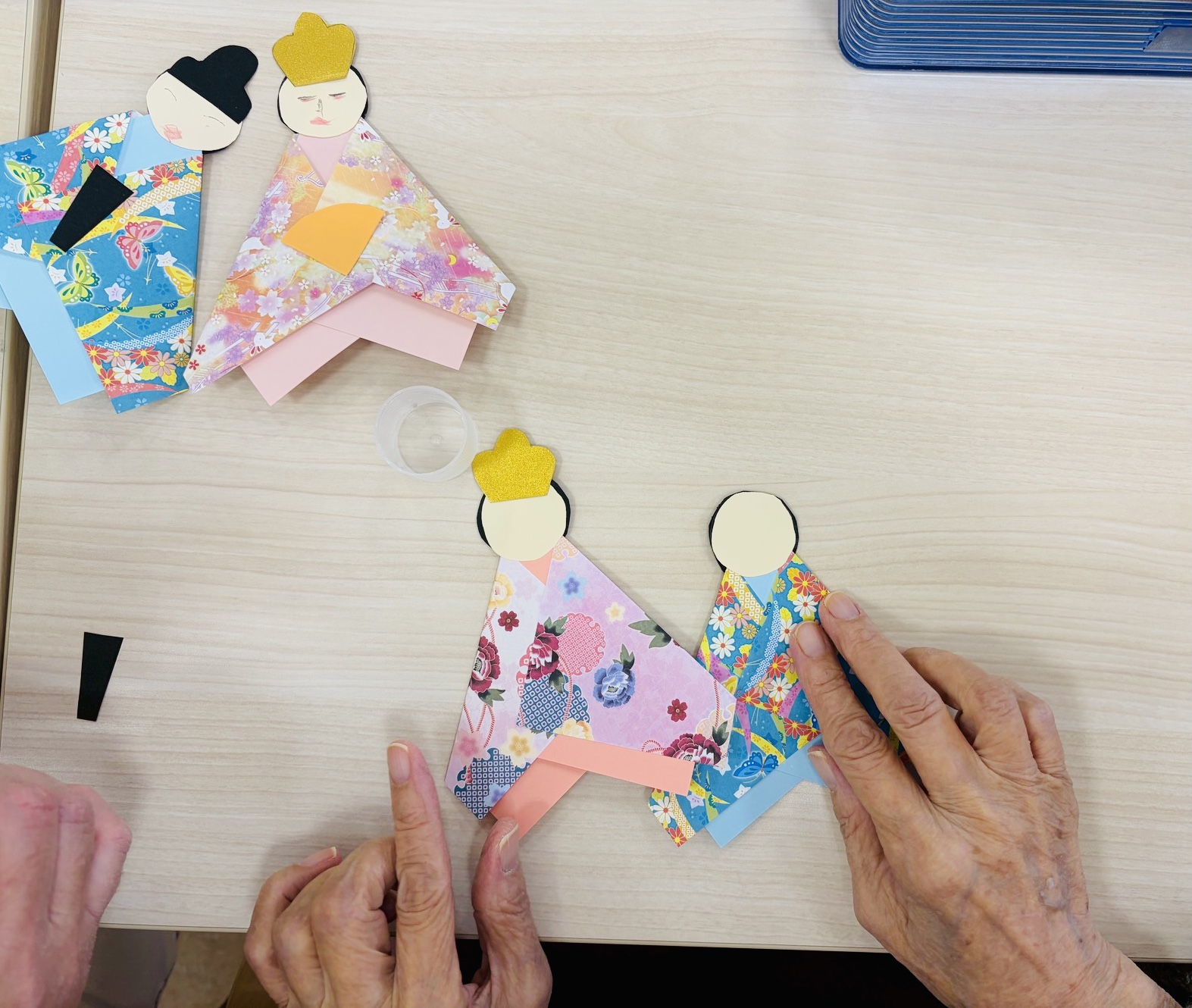 ↑ 千代紙を使って着物を表現しています。部品をノリで張り付けているところです。