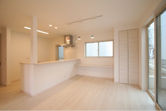 19帖のリビングには、高天井やカウンターデスクなどデザイン性も向上しながら実用性も兼ね備えた1邸です!
